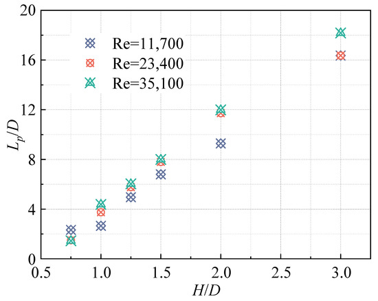In order to explore the general law of JCP distribution, the horizontal distance of the JCP from the jet pipe outlet is denoted by Lp. Figure 15 depicts the variation of the Lp/D with H/D for different Reynolds number conditions. As shown in the figure, at a lower Reynolds number, the jet contains less turbulent kinetic energy and its ability to mix the ambient fluid is diminished, resulting in a small Lp/D in most of the H/D range. In particular, in the smaller H/D case (H/D = 0.75), the wall attachment effect of the HSJ is very weak because there is very little ambient fluid below the main stream of the jet. At the same time, the lower jet velocity further weakens the wall attachment effect, and the main stream of the jet is no longer deflected towards the bottom wall. In addition, the fluid below the main stream of the jet has a large velocity gradient in the z-direction, which produces a clear boundary layer effect. The slip phenomenon occurs when the jet main stream diffuses to the boundary layer, resulting in a large Lp/D for a small H/D. Overall, the distribution pattern of Lp/D under different Reynolds number conditions has a high consistency and shows a relatively independent property from the Reynolds number when the Reynolds number of the jet increases.