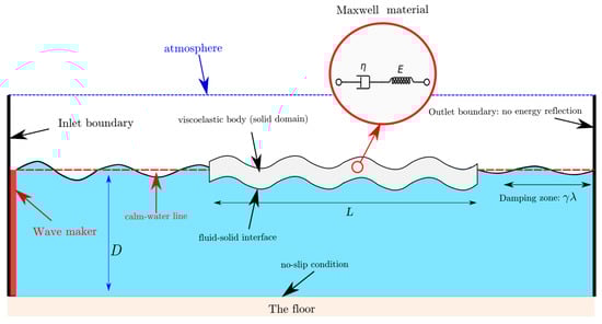The problem is solved by using OpenFOAM code, which allows us to decompose the equations governing the fluid and solid domains by using the finite volume method (FVM). The solids4Foam library is used [48], by employing which the coupled fluid–structure interaction problem can be simulated numerically. The upstream length is set to be greater than and the downstream length is set to be greater than in all tests. This prevents any artificial effect that the body can have on the wave generation.