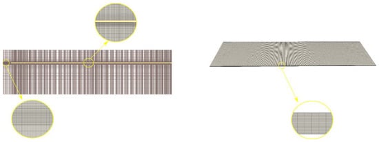 A structured mesh strategy is used as shown in Figure 3. Orthogonal cells are generated as the geometries of both fluid and solid domains are very simple. Cells are set to have finer size near the free surface, and in the vicinity of the cover. In the free surface neighborhood, the ratio of the length of the cell over its height has a maximum value of 1.5, which cancels out the artificial numerical energy damping that can be triggered by the cell size. A mesh study is also performed to evaluate the effect of cell size on the generated waves, and to find the cell size that can be employed to simulate the problem. The results of the mesh study are presented in Appendix A. In the solid domain, cells are set to be structured as well. The longitudinal motion of the solid body is stopped by defining vertical virtual patches, on which the shear stress is set to be zero. This means that, while these patches transport the momentum, they never have any longitudinal motion. The mesh motion is performed by computing the velocity of the fluid–solid interface. The mesh is regenerated at every single time step. A tolerance of is set for the cell motions.