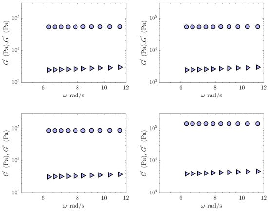 Measured values of storage (circles) and loss (triangles) moduli. The upper row shows the mechanical properties of covers 1 (left) and 2 (right), and the lower row shows the mechanical properties of covers 3 (left) and 4 (right). The data were measured by Sree et al. [34].