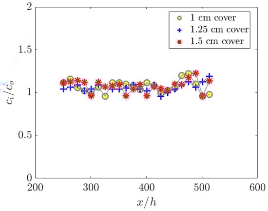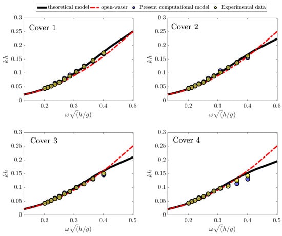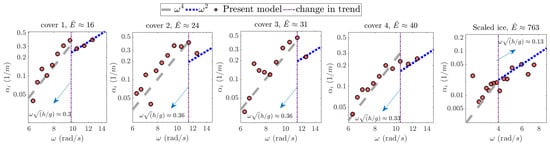 Similar behavior for the decay rate was observed by Meylan et al. [56], who documented and analyzed decay rates of their field measurements which took place in the Antarctic. They observed that decay rates of wave periods greater than 10 s grow with , but those of shorter waves grow with . Assuming that ice was 1 m thick, the elasticity number of their test would be ≈. The critical dimensionless frequency of their data is ≈ which is in between what is found for scaled ice (≈) and cover 4 (≈), which have elasticity numbers of ≈ and ≈, respectively. This gives more credit to our hypothesis, namely “the critical dimensionless wave frequency decreases with the increase in elasticity number”. Finally, note that the data presented in Figure 18 are very similar to experimental values and such an analysis could be performed using experimental data as well.
