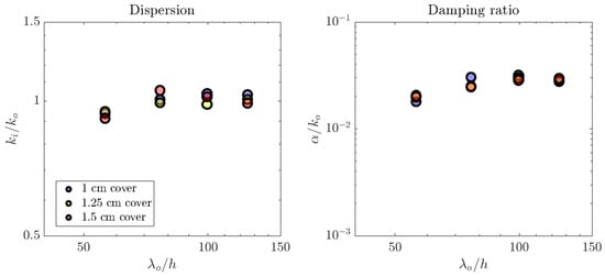 Wave amplitude attenuation and dispersion were computed under the ice cover by using the present computational fluid–solid model. To run the simulations, was prescribed to be 763. This number corresponds to a Young’s modulus of . Different values for were considered, and the related attenuation coefficients were computed. For the tested wave periods, the maximum attenuation rate occurred at .