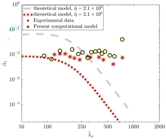 Some runs were first performed by setting the normalized viscosity to be close to the critical value of normalized viscosity. Attenuation rates are seen to be close to field measurements when normalized viscosity is set to be . The predicted values for attenuation rates are shown in Figure 16. Field data are also plotted in this figure. Attenuation rates and wavelengths of the incoming waves were all normalized. Thus, the field data and the ones found by using the computational fluid–solid model can be compared against each other. In addition, the attenuation rates were computed by employing the theoretical model and setting two different values of (corresponding to = ) and ( = ) for the ice viscosity. Therefore, the results of the computational fluid–solid model and the theoretical model can be compared with each other. The results of the computational FSI model are seen to be in line with the field data. The results of the theoretical model, however, do not match with the field data. The results of the theoretical model decrease with a high rate when normalized wavelengths are longer than . However, the field data and results of the present computational fluid–solid model do not behave in this way. Instead, they slightly decrease with the increase in wavelength, and at some wavelengths they experience a very sudden and small increase or decrease, which can be caused by different mechanisms. The sudden jumps in the attenuation rate, which can be seen in the results of the present computational data, are likely to be caused by the solid vibration of the cover and the boundary effects. The cover has a finite length with the upstream end being free, which can lead to partial energy reflection from the free end. The largest jump is seen to occur at the longest wave.