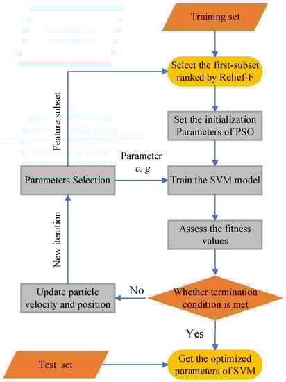 The flow chart of the hybrid optimization SVM based on Relief-F and PSO is shown in Figure 1. In the model, Relief-F filter is utilized to reduce the feature dimension, improving the calculation efficiency and PSO wrapper to optimized parameter combination (c, g) for better accuracy. The specific steps are as follows: