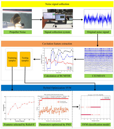 In this paper, a novel acoustic method for intelligent identification of propeller cavitation state based on CEEMDAN, RCMFDE, and hybrid optimization SVM is proposed. Firstly, CEEMDAN is applied to preprocess propeller noise to adaptively separate cavitation characteristic signals from propeller noise signals and reduce the influence of mode aliasing. Then, the RCMFDE algorithm is applied to extract the nonlinear complexity features of noise signals at different scales and the cavitation state of propeller can be distinguished from the perspective of nonlinear characteristics. Finally, to solve the problem of feature redundancy and parameter optimization, a hybrid optimization SVM classification model is established to realize intelligent identification of propeller cavitation and a higher identification accuracy is achieved. The rest of this paper is organized as follows. Section 2 introduces the basic principles and framework of the proposed method. Section 3 introduces the cavitation noise measurement experiment of the propeller model. In Section 4, the experimental data are analyzed based on the method proposed in this paper and compared with other methods. Finally, Section 5 is the conclusion of this paper.