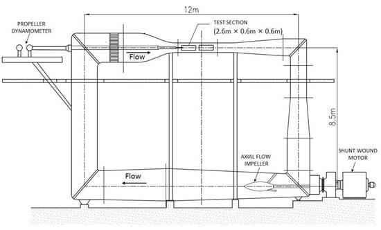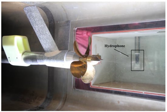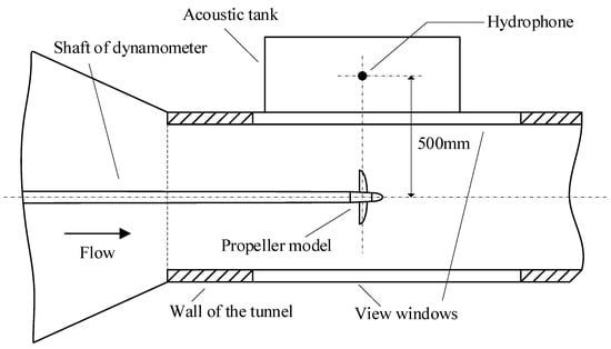 The acoustic measurement experiment of propeller model was carried out in the medium-sized cavitation tunnel of China Ocean Shipping Company (COSCO). The schematic diagram of the cavitation tunnel is shown in Figure 3. There is a four-blade axial pump at the bottom of the cavitation tunnel, which is driven by a DC shunt motor. By adjusting the power of the motor, the flow velocity of water in the tunnel can be precisely regulated. The tunnel is equipped with a pressure regulating device that can fine-tune the internal pressure within a certain range.