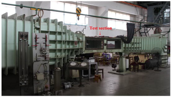 The test section is the core part of the cavitation tunnel, where the propeller is located and works in the given stable flow field. The test section lies in the upper middle part of the device, as shown in Figure 4. The length of the test section is 2.6 m, and the cross section is rectangular (0.6 m × 0.6 m) with rounded corners. The four sides of the test section are view windows made by acoustically transparent acrylic, through which the cavitation of the propeller can be observed from all around with the help of stroboscopic equipment. The propeller dynamometer drives the propeller in the test section through a long shaft and measures its thrust, torque and rotation speed in real time. The basic parameters of the cavitation tunnel are summarized in Table 1.