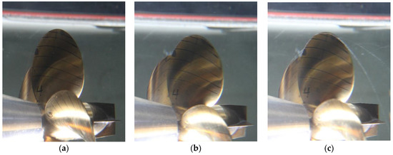 In our case, considering the efficiency of operation, the pressure and propeller rotation speed n are set as constant values to keep the cavitation number constant, and the thrust coefficient is regulated by changing the pump power, so that the propeller appears different cavitation states. Through early testing, the initial pressure of the test, the propeller rotation speed and inflow velocity are determined, in which propeller cavitation does not occur. Then slowly decrease the flow velocity, and observe the propeller vortex cavitation at the same time with the help of a stroboscopic device. It is observed that there is no cavitation until the exceeds 0.33, as the development of cavitation of propeller blades is not synchronous due to slight geometrical differences between blades. In this experiment, if only one blade exhibits cavitation it is regarded as cavitation inception, and 3 blades (more than half of whole 5 blades) exhibiting cavitation is full cavitation. The test conditions of three cavitation states including no cavitation, cavitation inception and full cavitation is outlined in Table 4, and the images of propeller cavitation at three states are shown in Figure 7. The sampling frequency of noise signal is 131.072 kHz, and propeller noise data of 30 s are collected for each cavitation state.