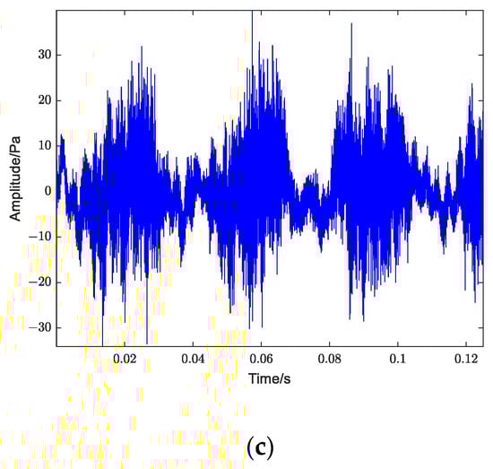 Original time domain diagram of propeller noise signal collected under three test conditions: (a) no cavitation; (b) cavitation inception; (c) full cavitation.