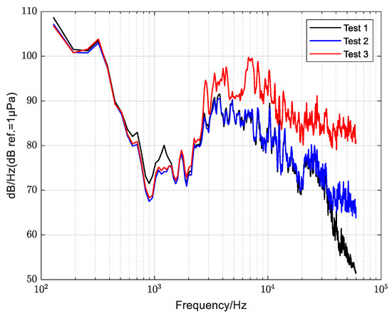 The original time domain diagram of the propeller noise signal collected in the test under three test conditions is shown in Figure 8. It can be seen that the time domain waveform and amplitude of noise in the inceptive stage of propeller cavitation are close to that without cavitation. In the stage of full cavitation, the noise amplitude increases and the propeller beat becomes obvious. The power spectrum of noise calculated under three conditions is shown in Figure 9. It is apparent that the power spectral densities of test 1 and test 2 are close in the whole frequency range, only except the frequencies above 30 kHz. However, the power spectral density of test 3 is clearly higher than the other two tests at frequencies above 2.5 kHz. The energy increased by the full cavitation spans a quite wide frequency range.