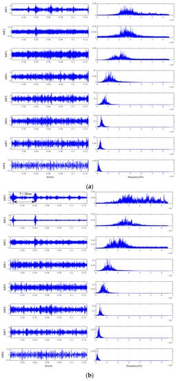 Waveform and spectrum only reflect unilateral information of signal in time domain or frequency domain, respectively, while CEEMDAN, as an adaptive decomposition method, can decompose the signal into multiple IMF components, which can reflect the characteristics of signal in time domain and frequency domain at the same time. The raw noise signals under three test conditions are decomposed by the CEEMDAN method, in which the noise standard deviation of CEEMDAN is 0.2, the average number of signal processing is 50, and the maximum number of iterations is 100.