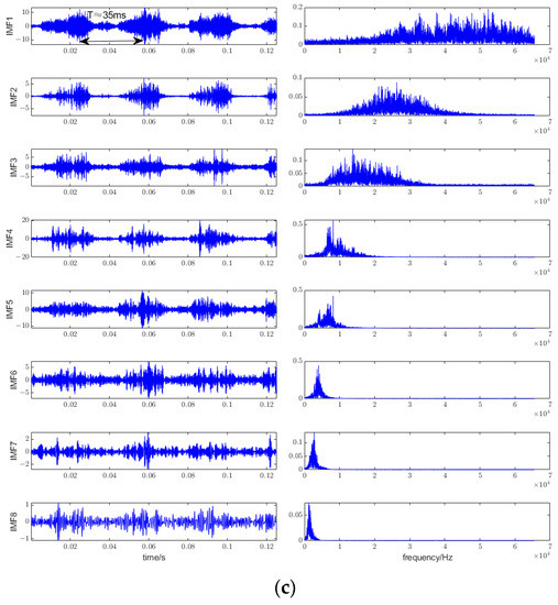 Figure 10 shows the CEEMDAN results under three working conditions. In the figure, the time domain waveform of IMF component is illustrated on the left, and the corresponding power spectrum of IMF component is given on the right. With the increase in IMF orders, the spectral centroid moves from high frequency to low frequency. Since the low frequencies of the higher order components are usually independent with cavitation, only the first eight order components are listed in the figure. It can be seen that in Figure 10a, when cavitation does not occur, there is no obvious pulse signal in the low-order IMF components. While in Figure 10b, after cavitation occurs, pulses with the same rotation period of the propeller (about 35 ms) appear in IMF1 and IMF2, and in Figure 10c, distinct periodic pulses propagate from IMF1 and IMF2 to low frequency band and appear in IMF3 to IMF6, which is consistent with the results of power spectral analysis. According to the frequency band range of cavitation energy influence in power spectrum analysis and the frequency band range of IMF signal, the first three IMF components are selected as cavitation characteristic signals in the test.