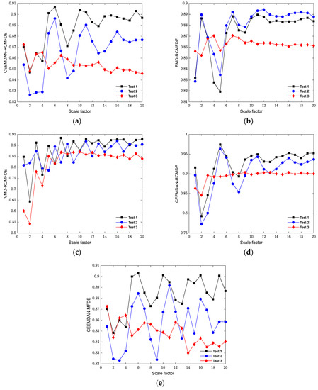 Relation between entropy and scale factor by different features under three test conditions: (a) CEEMDAN-RCMFDE; (b) EMD-RCMFDE; (b) VMD-RCMFDE (d) CEEMDAN-RCMDE; (e) CEEMDAN-MFDE.