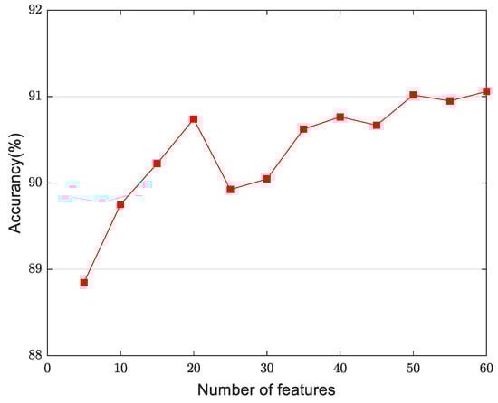The identification accuracy with the number of features selected by Relief-F of the training set is shown in Figure 12. It can be seen that the accuracy grows with the number of features when the number is less than 20. Nevertheless, when the number of features is 25 to 45, the accuracy is a little lower than that when the number of features is 20, indicating the negative impact of redundant invalid features on classification. When the number of features is greater than 45, the recognition accuracy is improved restrictedly compared to that when the number of features is 20. Considering the identification accuracy and computational efficiency, the number of features in this paper is set to 20. The PSO optimization process of SVM parameters is shown in Figure 13. It can be seen that with the increase in iterations, the accuracy keeps improving and eventually reaches 90.93%; the optimized penalty factor c is 53.05, and the kernel parameter is 0.82.
