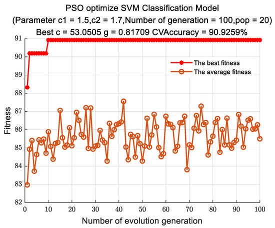PSO is a classical swarm intelligent algorithm designed by simulating the predation behavior of birds, which has the advantages of good robustness, good convergence and strong global search ability. When applied to SVM model parameter optimization, it can effectively solve the problem of blind parameter setting [13]. In the algorithm, the global optimal solution is achieved by iteratively updating the position of particle swarm according to Equations (17) and (18) [32].