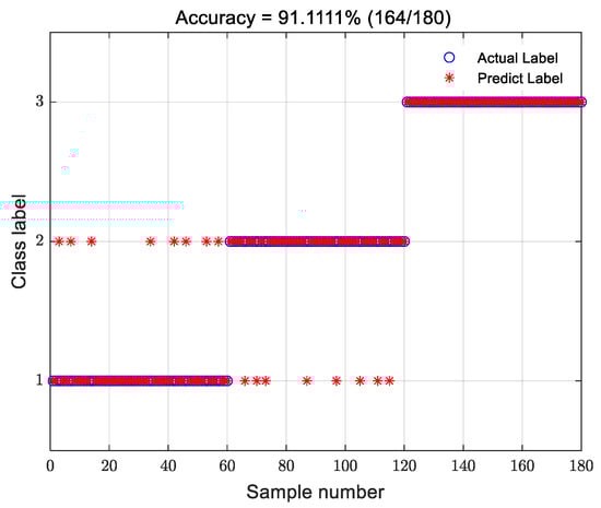 The identification result of the test set is shown in Figure 14. The results show that the recognition accuracy of severe cavitation samples can reach 100%, while the recognition rate of non-cavitation samples and slight cavitation samples is slightly lower, which are 86.7% (52/60) and 86.7% (52/60), respectively. The overall accuracy of the test set is 91.1% (164/180).