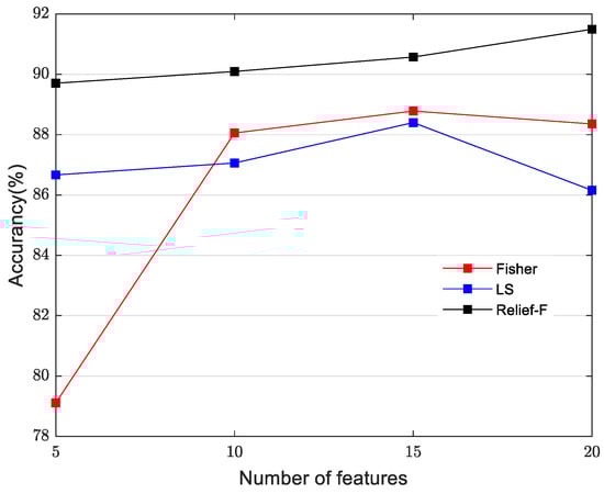 In order to demonstrate the superiority of the hybrid optimization SVM proposed in this paper, two other common filter-based feature selection methods, including the Fisher-ratio [33] and Laplace score (LS) [34] methods are selected for comparison. The first 5 to 20 features are screened to form feature vectors, and PSO is used to optimize SVM parameters. The identification results of the test sample are shown in Figure 15. It can be seen that the identification accuracy of the method proposed is superior to the methods based on Fisher and LS.