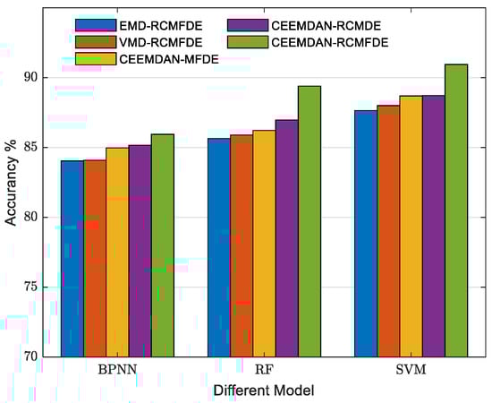 To further demonstrate the advancement of the method in this paper, the five characteristics mentioned above, EMD-RCMFDE, VMD-RCMFDE, CEEMDAN-MFDE, CEEMDAN-RCMDE, and CEEMDAN-RCMDE are selected to calculate. Three common machine learning models, back propagation neural networks (BPNN), random forest (RF) and hybrid optimization SVM, are used to classify the samples, respectively. Each method is tested 20 times, and the accuracy of each method is obtained as shown in Figure 16. The result shows that CEEMDAN-RCMFDE is a better feature than other features, and the combination of CEEMDAN-RCMFDE and hybrid optimization SVM can achieve the optimal identification accuracy.