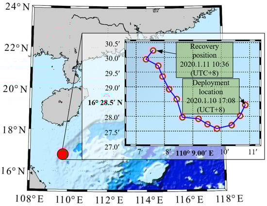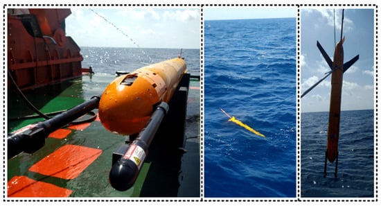 The DHUG began its observation on 10 January 2020 along a planned course near the continental slope in the South China Sea. After testing its various functions, the DHUG was deployed into the designated sea area (16°27.70′ N, 110°10.37′ E), and it moved in a sawtooth gliding pattern with a pitch angle of approximately 28° and a maximum diving depth of 600 m. The trajectory of the DHUG is shown in Figure 3.