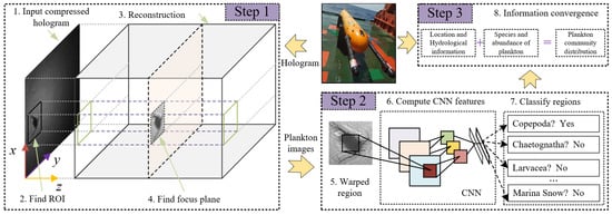 To automatically access the spatio-temporal distribution of plankton from the hologram images taken by the DHUG, three successive steps are undertaken, as shown in Figure 5. Step 1 is to extract the plankton images from the hologram. First, the position of the plankton in the holographic image (the x, y coordinates) is determined by background subtraction. The hologram is compressed to accelerate the data processing, and this step enables a rough estimation of the suspended particle concentration. Then, the extracted plankton region is reconstructed using the angular spectrum method (ASM), and the Sobel variance (SOL_VAR) focusing algorithm improved in this study is adopted to determine the axial position of the plankton in the hologram (the z coordinates). Step 2 identifies the extracted plankton species. The extracted plankton images are imported into the convolutional neural networks (CNN) to identify the plankton species. Step 3 depicts the relationship among the plankton information, the location of the DHUG, and the collected thermohaline structure.