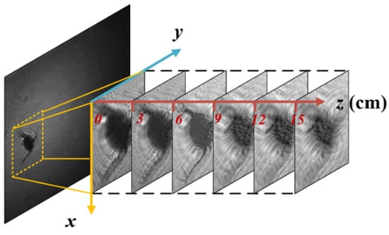 where , z represents the distance to the hologram plane, is the wavelength at which the laser propagates in the medium, and and are the refractive indexes of the laser in the air and seawater, respectively. By adjusting z in Equations (3) and (4), any of the cross-sectional images in the imaging volume can be obtained. Figure 6 shows the reconstructed image using ASM in the sampling volume.