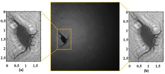 There may be only single plankton, or even nothing, in a holographic image taken in the South China Sea, as shown in Figure 4. Therefore, the reconstruction procedure is inefficient if all the holograms are selected. Hence, only those ROIs where plankton information is presented are reconstructed. The two Copepoda images shown in Figure 7 are the result of reconstructing a partial holographic image and the whole holographic image in Figure 4a, respectively. It can be seen that although the image quality is degraded, the processing time is greatly reduced. Therefore, for extracting plankton information from millions of holographic images that contain few plankton, it is worthwhile and necessary to sacrifice a small amount of image quality for processing efficiency. In addition, if a high resolution is required, the size of reconstructed images can be augmented appropriately.