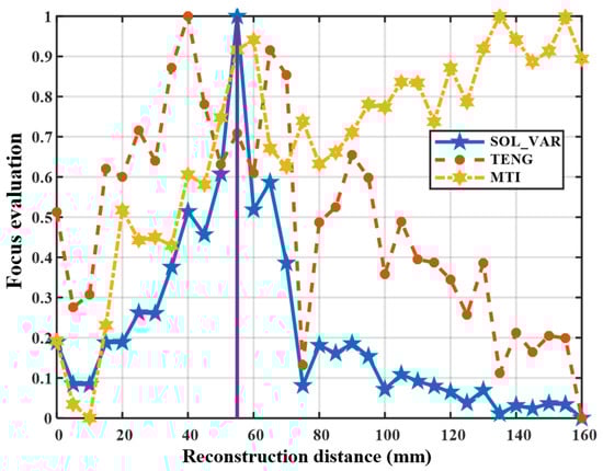 Finally, the images of each plane shown in Figure 6 (the reconstruction step is set to be 5 mm) are calculated and normalized according to the three algorithms to assess the effects (Figure 8). The locations of the best focus planes obtained by the three methods are listed separately in Figure 9. It can be seen that SOL_VAR obtains the best focus position, while the image obtained by the TENG algorithm deviates from the actual position, and MTI has a peak at the best location, but the result is masked by noise. The SOL_VAR algorithm outperforms two other methods in terms of unbiasedness, single-peak, and sensitivity to noise. The strengths and weaknesses of this algorithm will be explored in more detail.