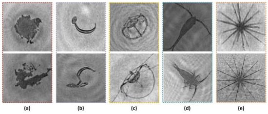 The intensity variation of the holograms in Figure 13a–e can accurately locate the positions of the suspended particles in the hologram images. Since the diffraction spots formed by the suspended particles in the hologram are larger, the minimum boundary box in regions 2–6 defined in Figure 13 is larger than the plankton volume for better light transmittance. The 1.5 mm suspended particles at the edge of the hologram in Figure 13e are well detected when the hologram intensity distribution is not uniform. The choice of thresholds in adaptive hybrid Gaussian models and the updated model speed is directly related to the quality of the detection results. Further, the morphological calculations on the graph affect the splitting of the suspended particles into multiple particles. Appropriate parameters are applied in the automatic calculation by adjusting the model, and the test results on typical plankton are satisfactory. However, the fragmentation issue of plankton with very long tentacles still exists.