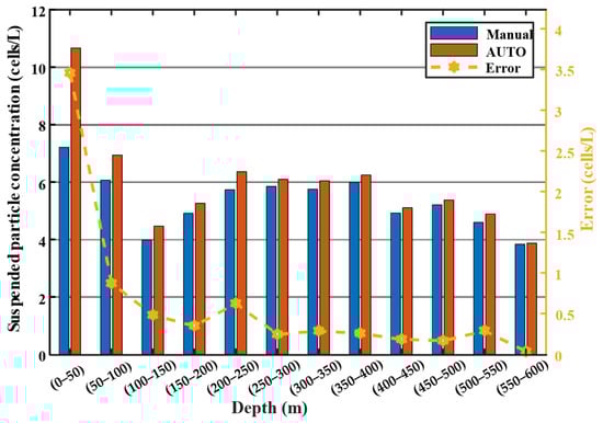 The sampling image volume of the digital holographic system is fixed, and so the concentrations of the suspended particles can be estimated by counting the number of ROIs in each holographic image. To further speed up the processing of hologram sequences and to ensure processing accuracy, the scaled holograms are conservatively scaled from 2048 × 2048 pixels to 480 × 480 pixels. Figure 11 illustrates the concentrations of the suspended particles obtained automatically (blue) and manually (red) at different depths, summarized from all the data collected by the DHUG in the South China Sea. Manual processing may affect the statistical results due to operator fatigue, etc., but the manual processing results are assumed to be accurate. The error represents the difference between the suspended particle concentrations obtained by automatic and manual treatment. The relationship between the suspended particle concentration error and the depth is obtained by the automatic processing of the hologram sequences taken by the DHUG at different profiles, as shown in Figure 12.