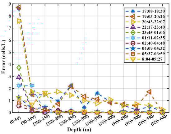According to the previous assumption, the statistical results show a high similarity between the results obtained from automatic extraction and those from manual processing, but the automatic processing overestimates the particle concentrations and the error between the two approaches tends to decrease with depth. The automatic processing results of a holographic image acquired from below 50 m at different profiles are pretty good, but they contain larger errors in the shallow water. In general, the number of suspended particles in the holographic image obtained by subtracting the background is accurate. Figure 11 shows that the error between the automatic and manual analysis is less than 0.9 cells/L when the depth is greater than 50 m, and it decreases with increasing depth. According to Figure 12, this is even true for all holographic images taken at different times. A maximum error exists at above 50 m, and this value is highly related to the sampling time.