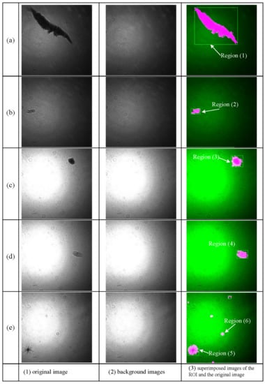(a–e) Extracting the ROI in Figure 4b–f gets regions 1–6. The left column shows the holograms of plankton, the middle column shows the corresponding background images, and the right column shows the superimposed images of the ROI and the original image obtained by background subtraction.