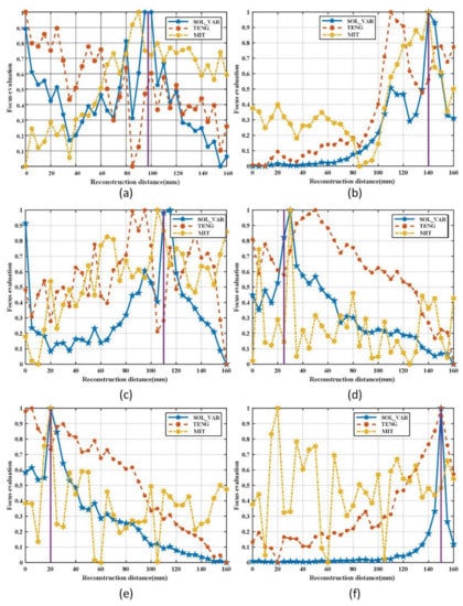 The focus evaluation with the functions of SOL_VAR, TENG, and MIT after reconstructing the hologram with a step size of 5 mm. The results are normalized, and (a–f) correspond to regions 1–6 of Figure 13. The purple vertical line represents the position of the actual focus plane.