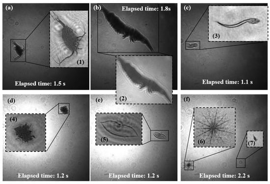 Montages obtained by processing the holograms of Figure 4a–f using the algorithm proposed in this paper. (a–f) with processing times respectively of 1.5 s, 1.8 s, 1.1 s, 1.2 s, 1.2 s, 2.2 s. (1–7) are extracted plankton images.