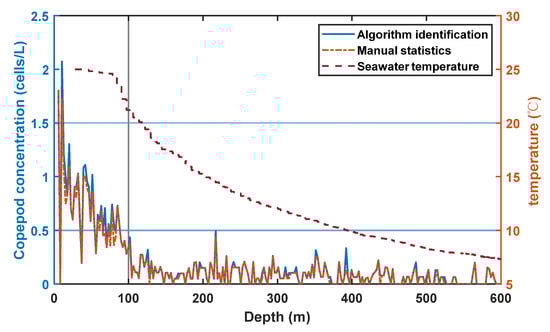 By training the CNN with the established plankton library, a validation accuracy of 88.36% is finally obtained, and the automatically extracted plankton images are imported into the CNN for plankton species identification. Furthermore, the spatio-temporal distribution of the plankton is obtained by combining the hydrological information collected by the DHUG. The most common Copepoda in the ocean is taken as an example here. The object detection method for holographic images is applied for processing the holographic sequences taken in this sea trial to obtain the relationship between the number of Copepoda and the depth, as shown in Figure 17.