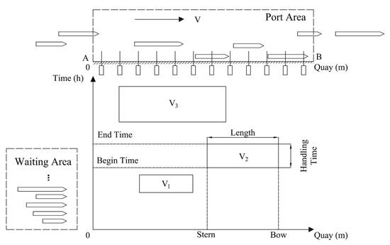 The whole problem can be abstracted as a two-dimensional problem [48] illustrated in the lower part of Figure 1. In the established model, the movement of the vessel is projected to the direction of the shoreline after entering the port area, and the transverse movement perpendicular to the shoreline is ignored (the upper part of Figure 1). Vessels are represented by rectangles, of which the length and the height corresponds to the ship length and the handling time, respectively. The coordinate of lower-left vertex is the distance away from the origin and the beginning handling time. The vessels in the study are set to be waiting in the same anchorage area, so the initial coordinate of each vessel is its negative ship length.