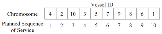 The chromosome was encoded using a string of the vessel number in the order of entering the port. An example of the chromosome is shown in Figure 3. The chromosome given in the example shows that 10 vessels waiting for entering the port in order are vessels 4, 2, 10, 3, ⋯, 1.