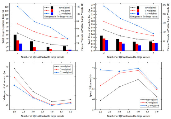 Figure 6. Scheduling results of different numbers of QCs allocated to large vessels.