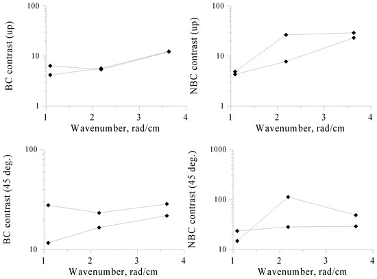 BC and NBC contrasts in the upwind direction are consistent, in general, with those in our previous studies growing with wave number (see, e.g., [16]). A similar behavior is observed for 45° contrasts, although they are noticeably larger than for the upwind direction.