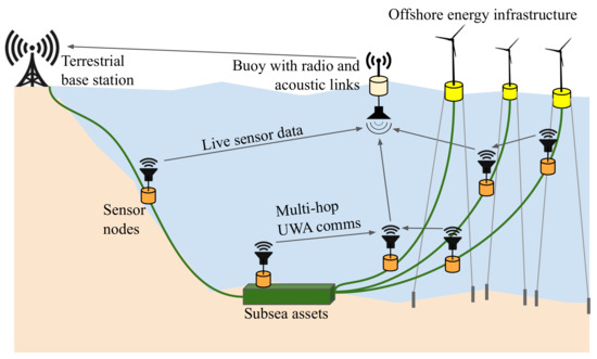 Example of an UWA sensor network deployment for monitoring offshore energy infrastructure.