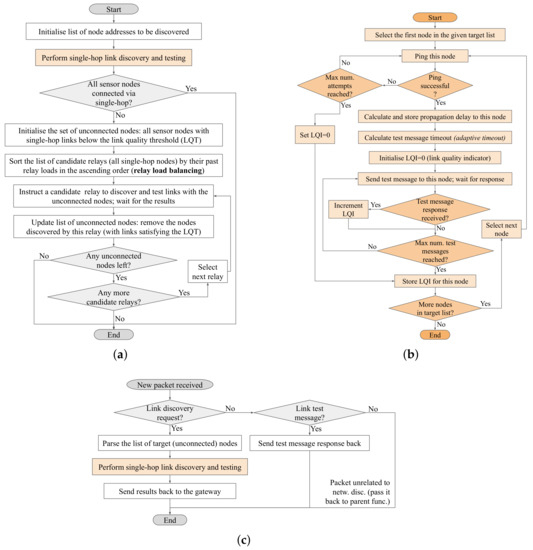 Overview of the network discovery protocol. (a) Overall gateway protocol flow; (b) Single-hop link discovery and testing function, employed by the gateway and relays; (c) Overall sensor node protocol flow.