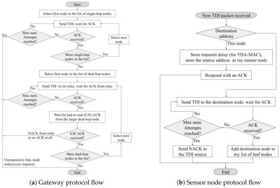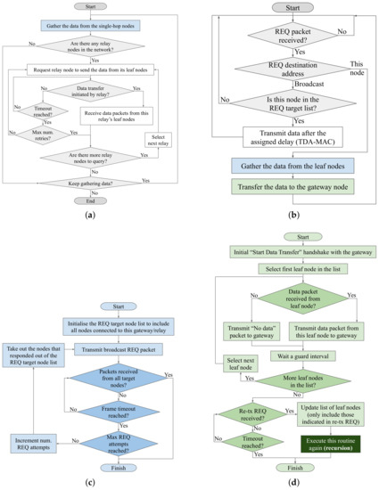 Figure 4a summarizes the logic performed by the gateway node. It is largely based on the Sequential Dual-Hop TDA-MAC protocol proposed by us in [45], with a modified sequence for transferring data from a relay to the gateway node, and, crucially, with an added retransmission capability via multi-node ARQ, integrated into the TDA-MAC protocol without the need for any additional control transmissions, as described in Section 2.6. At the start of a data gathering cycle, the gateway first instructs all sensor nodes connected directly to it (single-hop nodes) to send their data packets (the transmission times are managed via TDA-MAC explained in Section 2.4). It does so using the process shown in the flowchart in Figure 4c, described in more detail later in this subsection. Then, if the network topology includes any dual-hop sensor nodes, the gateway loops through every relay node, instructs it to gather the data from its leaf nodes (i.e., sensor nodes connected to this relay) and wait for the relay to report this data back to the gateway. If the relay node fails to initiate a data transfer handshake after a timeout period, the gateway sends another request to this relay, until the data transfer handshake is successful or the maximum number of attempts (e.g., three) is reached.