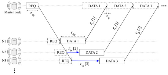 Figure 5 shows an illustrative example of the packet flow in TDA-MAC. The master (gateway or relay) node transmits a broadcast REQ packet (of duration ) that is received by every target sensor node at a different time (due to large differences in propagation delays of acoustic links). Each sensor node n then waits for a specific (individually assigned) amount of time before transmitting their data packet (of duration ) back to the gateway node, such that the data from all sensor nodes is received in an efficient “packet train” pattern as shown in Figure 5.