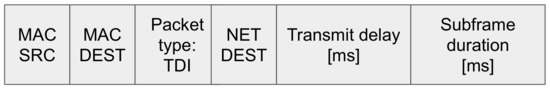 Figure 7 shows the TDI packet structure used in the network setup phase. It includes the network destination address (NET DEST) to distinguish between TDI sent directly from the gateway to the target node, and those intended to set up dual-hop links, i.e., addressed to a node outside of the gateway’s range. The address fields of the TDI packet are used by the sensor nodes to set up their routing, by storing the addresses of their master node and leaf node(s) (if any), whereas the “transmit delay” and “subframe duration” fields are used to set up the TDA-MAC parameters at each node for the data gathering stage, with the latter only intended for relay nodes (telling them how long their TDA-MAC subframe is).