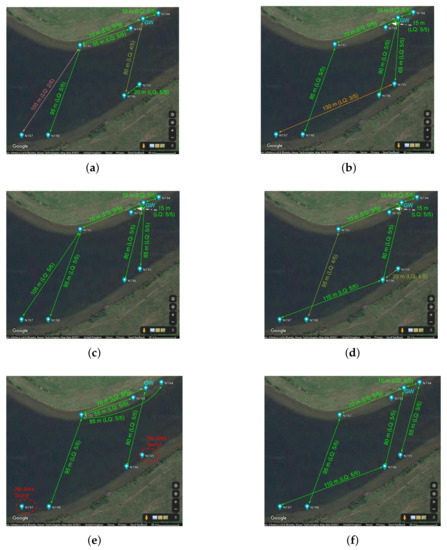 The process of discovering and testing the links is shown in Figure 2b. When the gateway or a candidate relay needs to discover a link to a particular sensor node (referenced by its address which is known a priori), it starts by sending a ping to see if there is a direct acoustic link with it, and also to measure the propagation delay on this link (based on the recorded roundtrip time of the ping exchange). If it fails to receive a ping response in attempts (e.g., we used in the trials), the link to this node is deemed non-existent, and the LQI for this link is set to zero: , where is an link quality matrix, i is the index of the master node initiating the ping exchange, and j is the index of the target sensor node. If the ping exchange is successful and there is a direct acoustic link between the two nodes; the propagation delay is measured and stored by the master node. In our previous work in [43,44] the link discovery procedure ended at this point, i.e., successful ping → a link was found → move on to discovering other links. While this approach was fast and energy-efficient, its key disadvantage was the lack of any information on the link quality (i.e., a successful ping exchange does not mean this will be a reliable link for subsequent data communication). The new approach, shown in Figure 2b, follows the ping exchange with test message exchanges, with the master node i counting the number of times it receives a response from the target node j and storing this number as the LQI for this link . The format and length of these test message transmissions is similar to the normal data transmissions; therefore, they provide a more representative estimate of the link quality than short ping transmissions. An important parameter for these test message exchanges is the timeout period, i.e., how long does the master node wait for a response before giving up and moving on (to the next test transmission or to the next node). This timeout period is calculated using the propagation delay estimate for the given target node obtained via a preceding ping exchange: