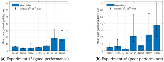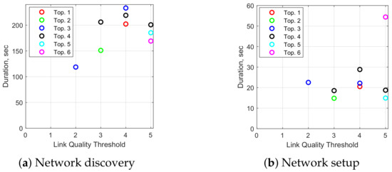 Figure 23 shows how the duration of the network discovery cycles is affected by the number of undiscovered sensor nodes (nodes for which no single- or dual-hop links were found), and by the number of discovered dual-hop nodes. Interestingly, the network discovery duration statistically decreases with the number of undiscovered nodes (from 0 to 6), showing that larger network topologies took longer to discover, despite having fewer unresponsive links and ping timeouts. This is because the quality of the links obtained via the link testing process described in Section 2.2 was often below the link quality threshold ( for most of the deployment), thus requiring further dual-hop network discovery and link testing. The variability in the network discovery duration is significantly larger in cases where most nodes were undiscovered, i.e., the majority of the network discovery process was spent waiting for ping and test message timeouts. Figure 23b shows that the duration of the network discovery process statistically increases with the number of dual-hop nodes, which is an expected outcome—finding good dual-hop links is significantly more time-consuming than single-hop links, especially if there are several relay candidates to iterate through.