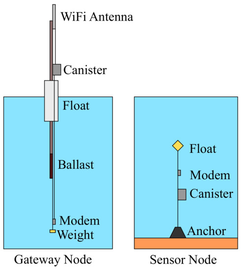 The use of large scale wireless sensor networks (WSNs) for remotely monitoring the ocean environment is becoming increasingly feasible, owing to the recent developments in underwater acoustic (UWA) modem capabilities [1,2,3,4]. Underwater WSN deployments will have a wide range of applications, e.g., water quality monitoring [5], seismic monitoring [6], marine animal tracking [7], off-shore asset monitoring [8], coastal defense [9], etc. The WSN approach to ocean monitoring provides significant advantages over the traditional deployment of data logging sensor nodes from dedicated ships because WSNs allow flexible long term deployments and eliminate the need to retrieve the sensor nodes from the sea to obtain the data. Figure 1 shows an example of the type of an UWA sensor network (UASN) deployment considered in this study. A surface gateway with radio and acoustic communication capabilities is deployed to provide a data sink for the underwater sensor nodes equipped with acoustic modems, e.g., carrying out real-time monitoring of off-shore energy infrastructure, and relaying these sensor readings to an on-shore base station via a wireless radio link.