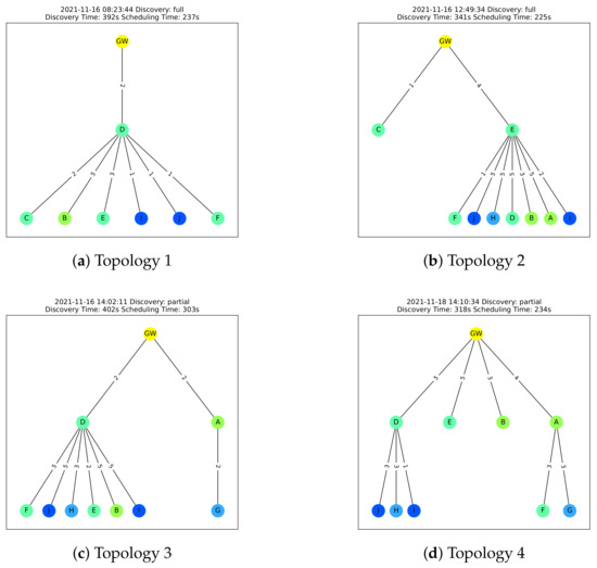 Figure 21 shows several examples of the network topologies established by the network discovery protocol in the North Sea deployment. They show that most sensor nodes were connected to the gateway via dual-hop links, with few direct links between the gateway and sensor nodes. This is a challenging scenario for the network discovery protocol, since establishing direct links with the gateway is significantly faster than searching for dual-hop links via relays, and since the probability of encountering unresponsive links increases with the number of target dual-hop nodes, which further extends the duration of the network discovery.