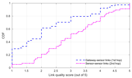Figure 25 highlights the issue of weak gateway connectivity; it shows the distribution of the average link quality in each network discovery cycle, separating the first hop (gateway—sensor node) and second hop (relay sensor node—leaf sensor node) links. The CDFs show a significant difference in the link quality between the first and second hop links. Those distributions were expected to tend towards the same curve over a large statistical sample (hundreds of links), as both the sensor nodes and the gateway used identical hardware.