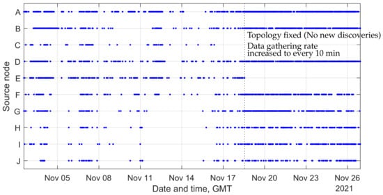 Figure 26 shows the packet delivery timeline, where every blue dot represents a successful packet delivery from the corresponding node. The graph shows long periods of node outage, where some nodes were unable to connect to the gateway via the network discovery protocol. It also shows that, when the nodes did manage to connect to the network, the packet delivery performance was patchy, with many data packets failing to be delivered. at 13:15 on 18 November 2021, the network was configured to run in the data gathering mode indefinitely (with no new network discoveries), and with the data gathering frequency increased to once every 10 min. Eight out of ten sensor nodes were connected in this phase, and their data gathering performance improved, owing to a relatively good topology discovered by the protocol and an improvement in the channel conditions.