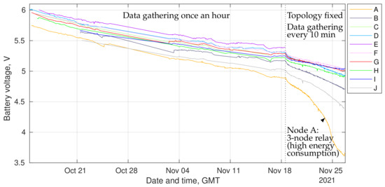 Figure 28 plots the real-time battery voltage data gathered from each sensor node throughout the duration of the sea deployment. It shows that the battery voltage decreased at approximately the same rate during the first month for all sensor nodes, except Node A which was using more energy as it was selected by the gateway as a relay node significantly more often than other nodes (due to limited network connectivity discussed earlier in this section). This difference in the energy consumption is especially visible in the last phase of the deployment (18–26 November), where the topology was fixed, the data gathering interval was reduced from 1 h to 10 min, and Node A was relaying data for three other sensor nodes (see the network topology in Figure 21d).